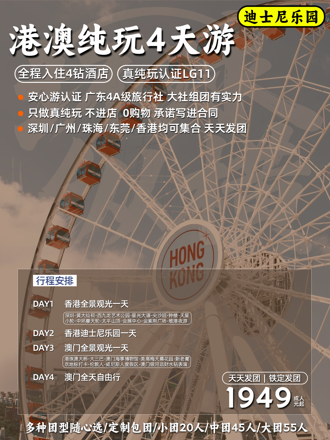 LG11港澳4天(香港观光+迪士尼+澳门观光+自由行)住澳 港澳游产品《真纯玩》跟着我们不踩坑,无购物《国深旅郑重承诺》