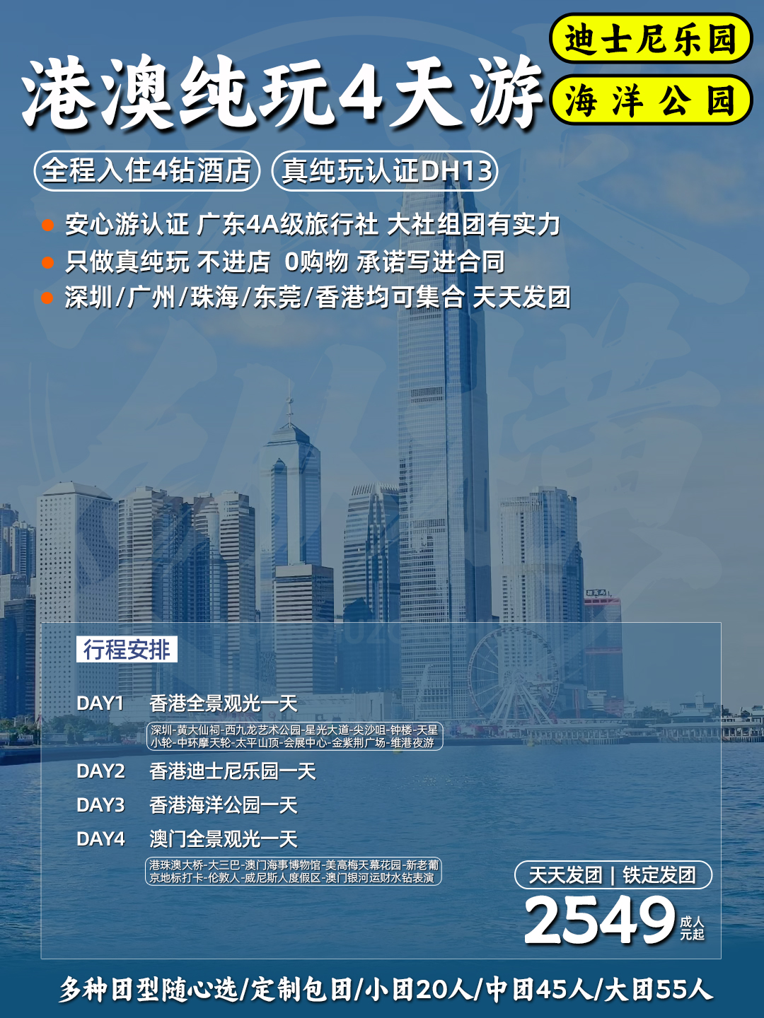 DH13港澳双园4天 (香港观光+迪士尼+海洋公园+澳门观光) 港澳游产品《真纯玩》跟着我们不踩坑,无购物《国深旅郑重承诺》