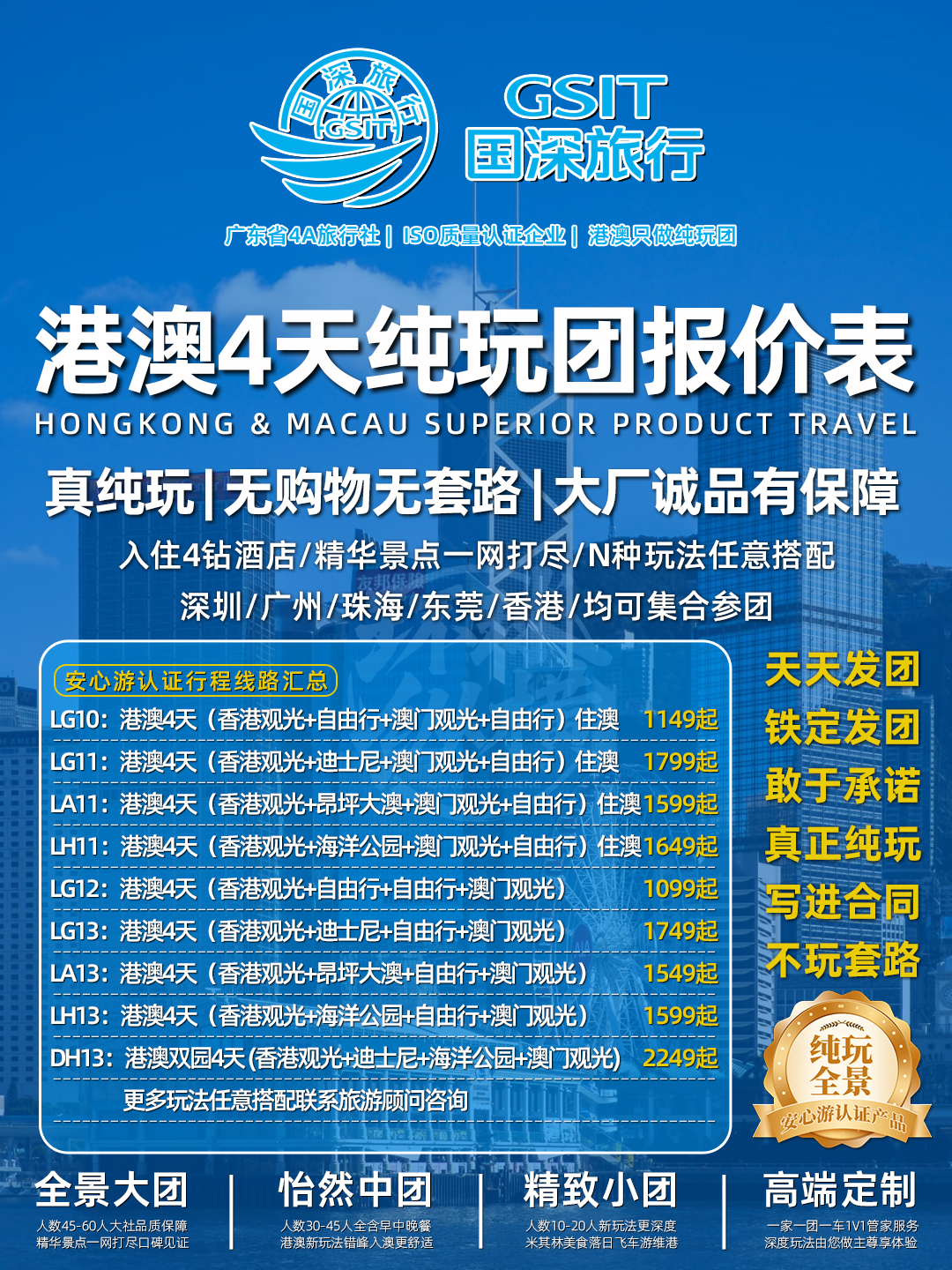 作为广东省4A旅行社、ISO质量认证企业,他家港澳游只做纯玩团,大厂出品,靠谱有保障!